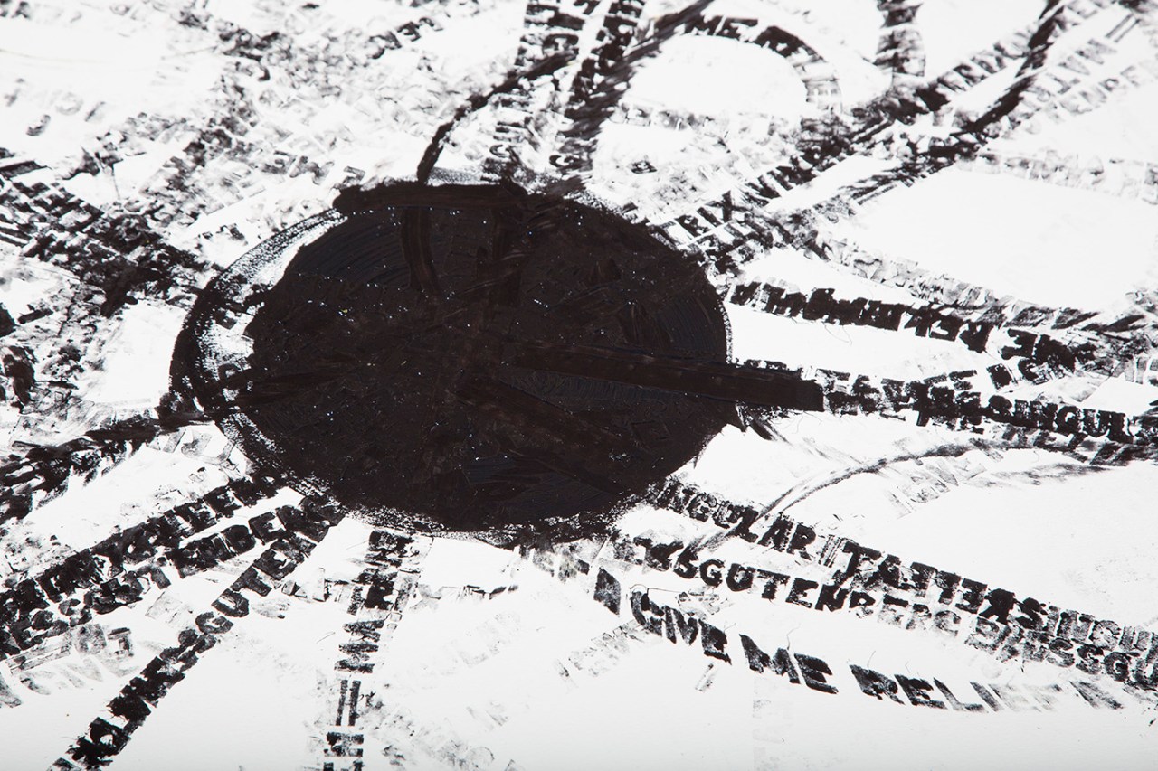 Rolling back and forth over a single spot of ink, the wheels of a skateboard offer the point of contact and the matrix of the performance.